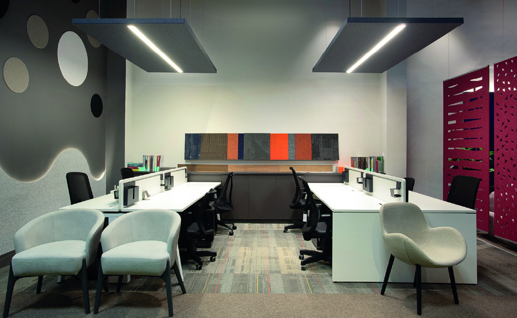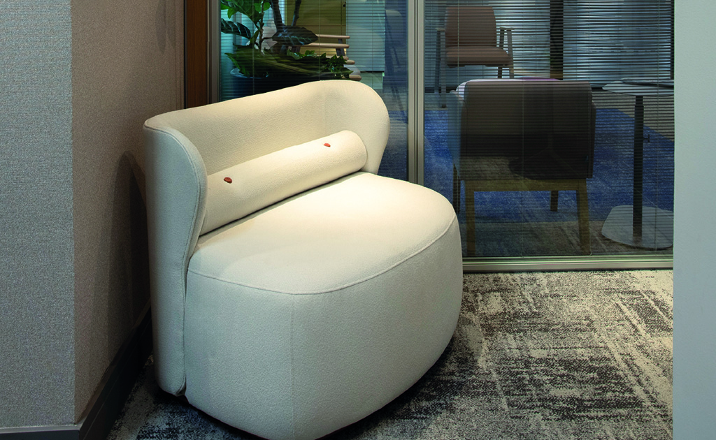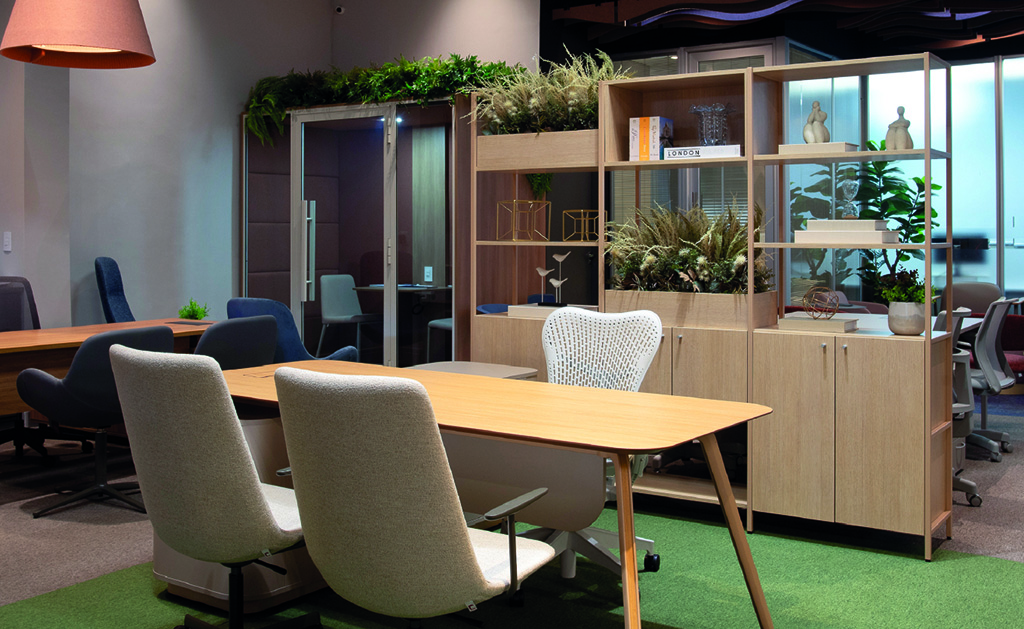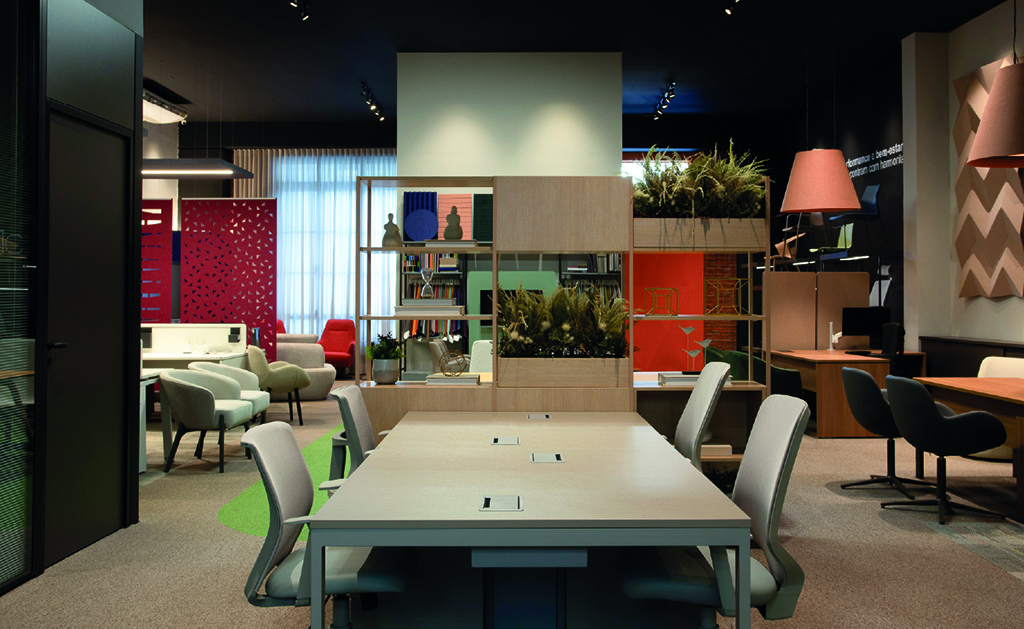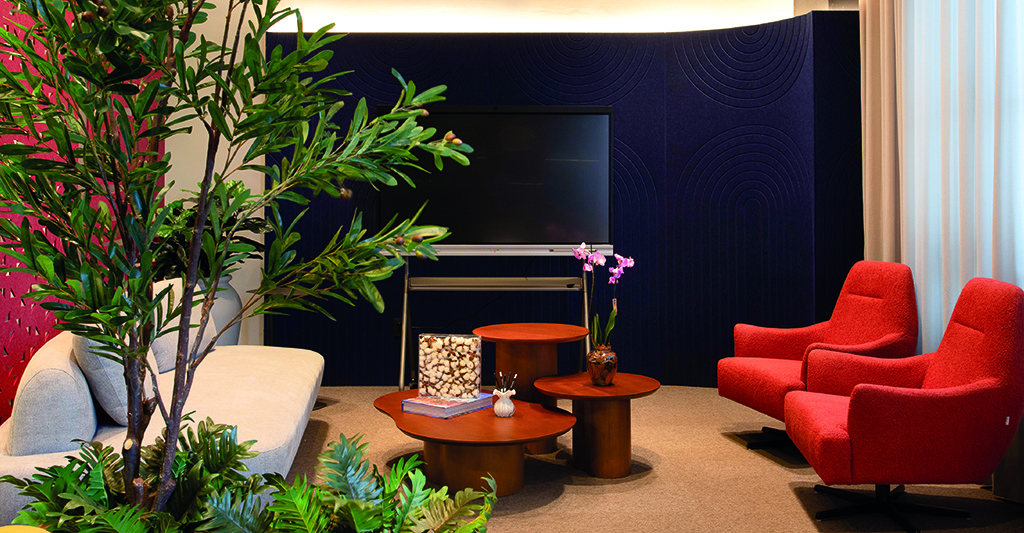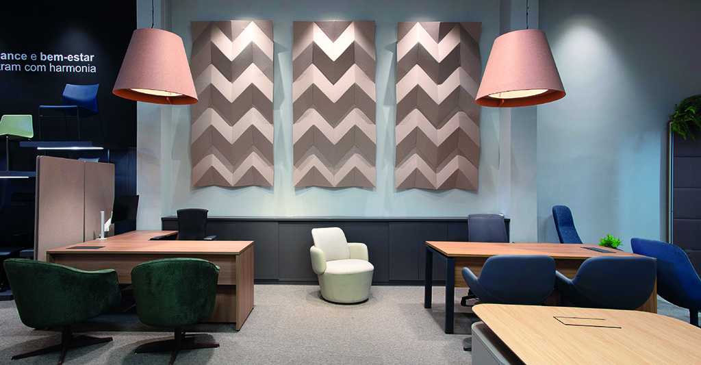 O showroom também evidencia soluções que vão além do mobiliário tradicional. A estante Flow se destaca pela multifuncionalidade, sendo ideal para armazenamento, decoração e separação de ambientes, criando composições dinâmicas e integradas. Já a cabine Oasis, uma forte tendência em projetos atuais, responde à necessidade crescente de foco e privacidade em plantas abertas, áreas produtivas e espaços compartilhados, oferecendo um refúgio acústico para concentração e reuniões rápidas.