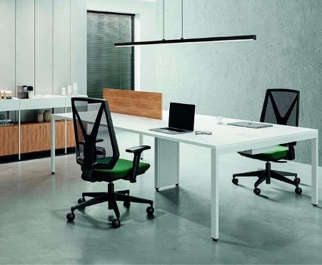 Na Bortolini, por exemplo, há mesas com pés metálicos, tampos em tons neutros ou madeirados, que se integram tanto em home offices quanto em outros projetos corporativos.