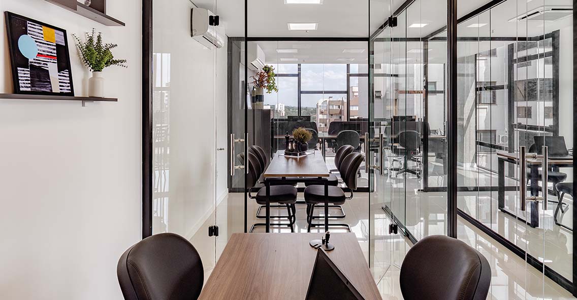 A paleta de cores sóbrias e a vegetação dialogam com os ambientes totalmente envidraçados do espaço, privilegiando a entrada de luz natural e conectando o escritório com a bela vista da cidade.