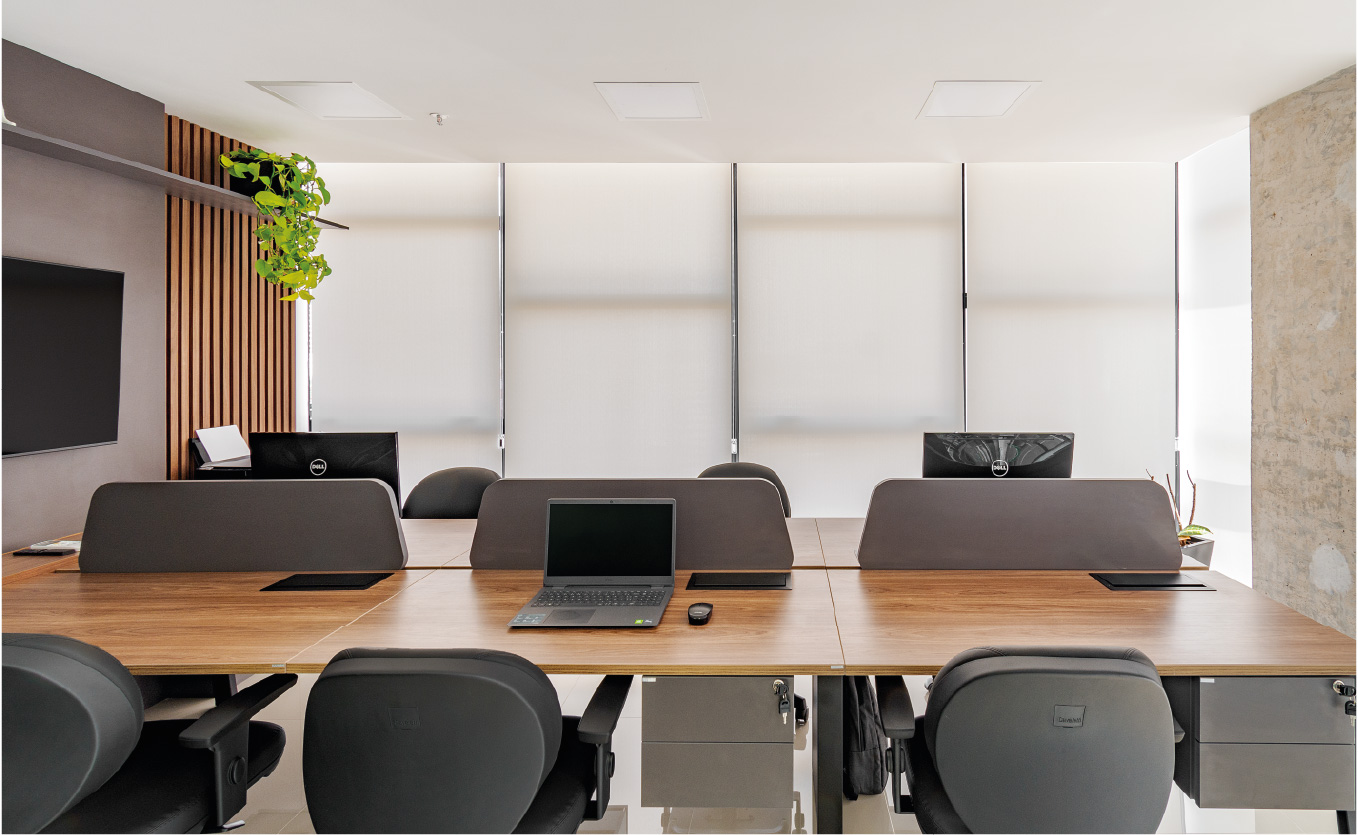 Nos ambientes foram utilizadas estações de trabalho, mesas de reunião e de trabalho, numa composição de cores neutras. A opção de pé quadro trouxe solidez e elegância ao mobiliário, deixando os ambientes clean e minimalistas.