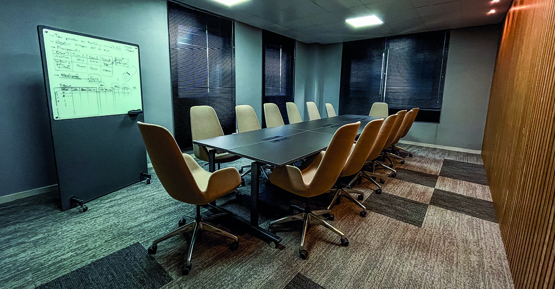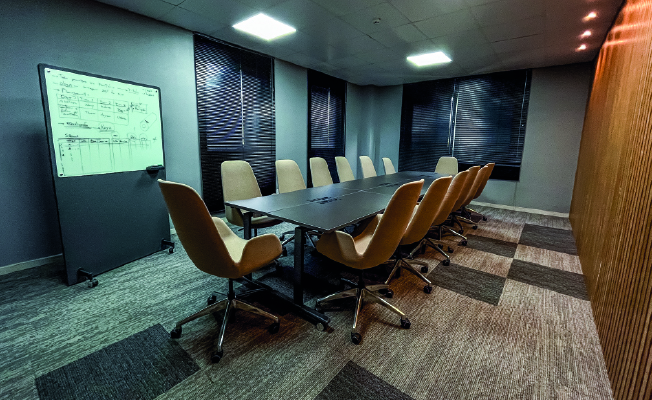As mesas Ease foram usadas para montar esta mesa de reunião. Com tampo rebatível, contam com rodízios para melhorar a mobilidade e permitindo a criação de diferentes ambientes, além do armazenamento inteligente e que ocupa pouco espaço quando não estão sendo utilizadas.