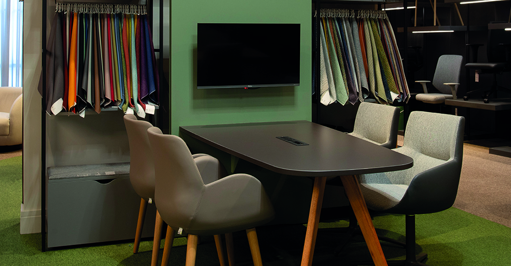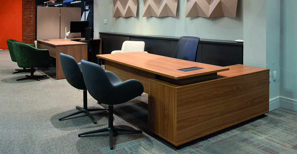 O showroom também evidencia soluções que vão além do mobiliário tradicional. A estante Flow se destaca pela multifuncionalidade, sendo ideal para armazenamento, decoração e separação de ambientes, criando composições dinâmicas e integradas. Já a cabine Oasis, uma forte tendência em projetos atuais, responde à necessidade crescente de foco e privacidade em plantas abertas, áreas produtivas e espaços compartilhados, oferecendo um refúgio acústico para concentração e reuniões rápidas.