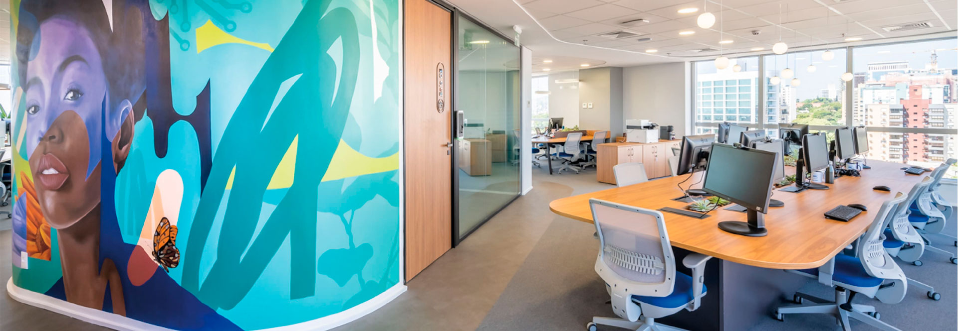 O ambiente bem iluminado é responsável pela atmosfera de moderna tranquilidade que o espaço transmite, gerando bem-estar para as equipes de colaboradores.
