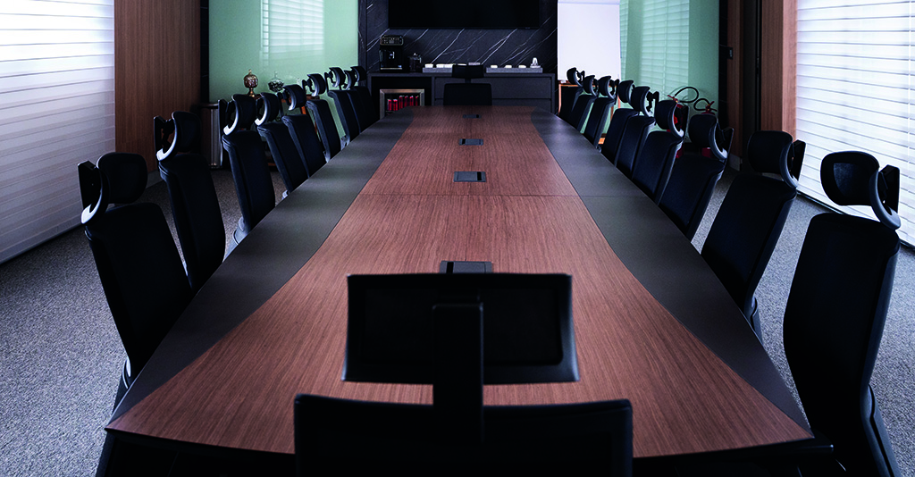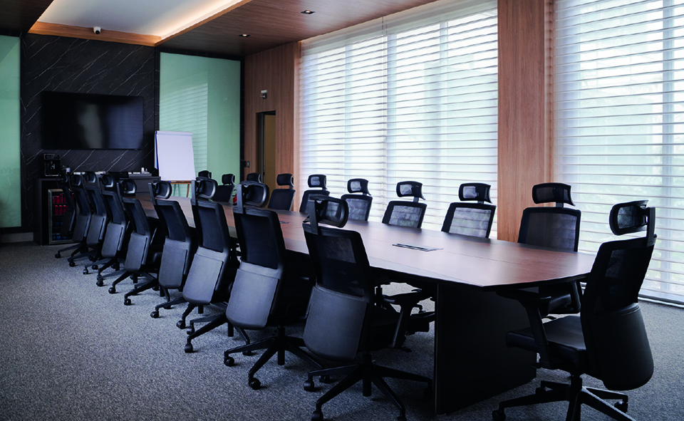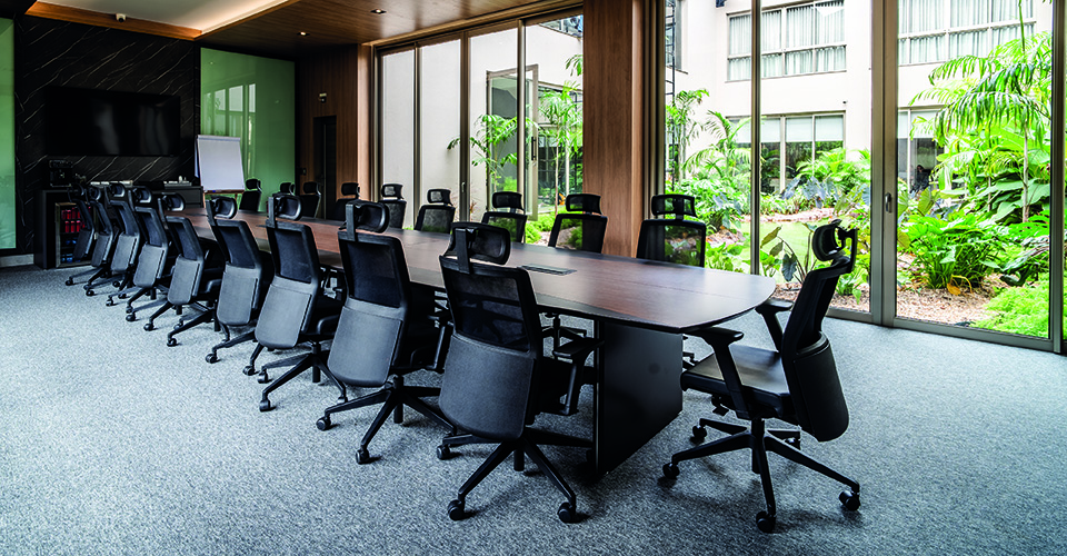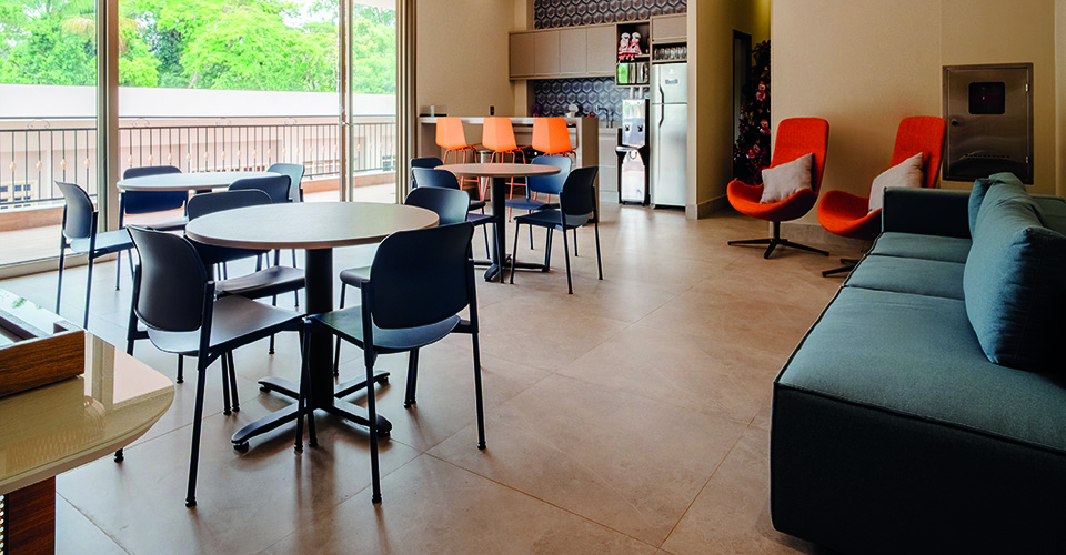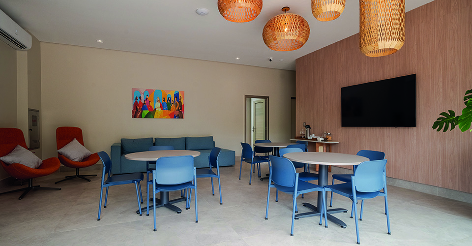 A escolha do mobiliário Bortolini teve papel central na composição dos espaços. A mesa de reunião Premium garante imponência, sofisticação e conforto em encontros estratégicos. Já nos ambientes de refeitório e socialização, as mesas redondas da linha Ethos proporcionam acolhimento e fluidez, favorecendo o convívio entre as equipes.