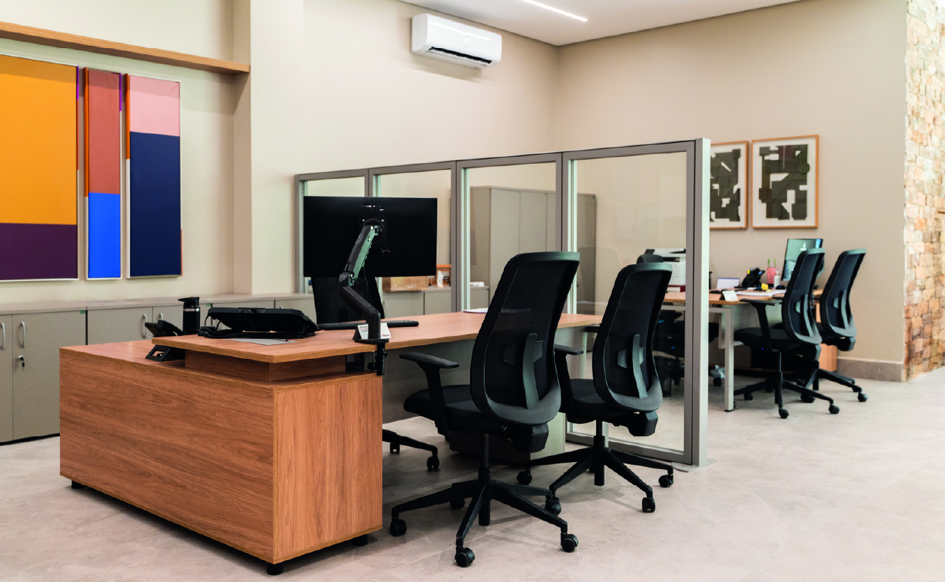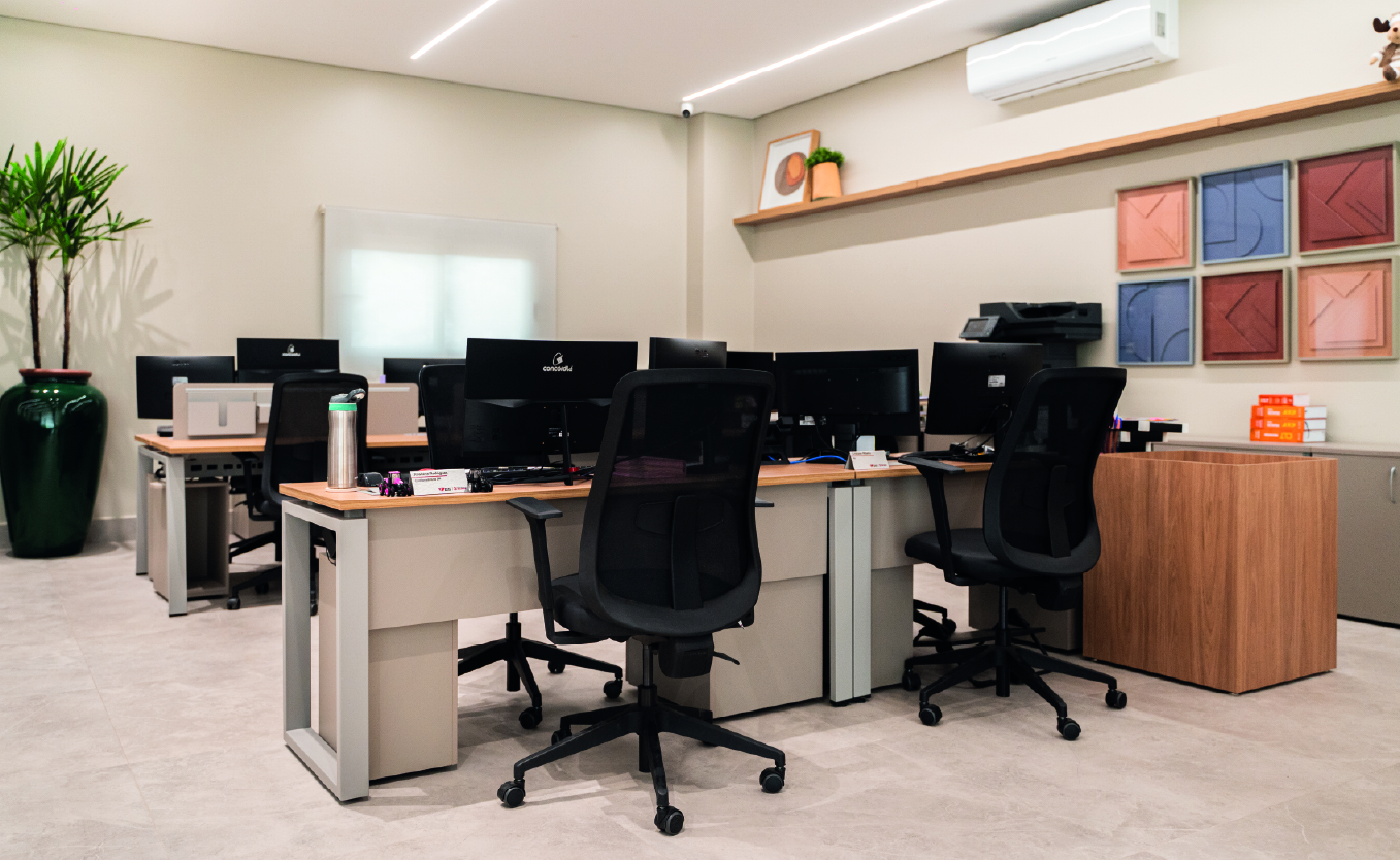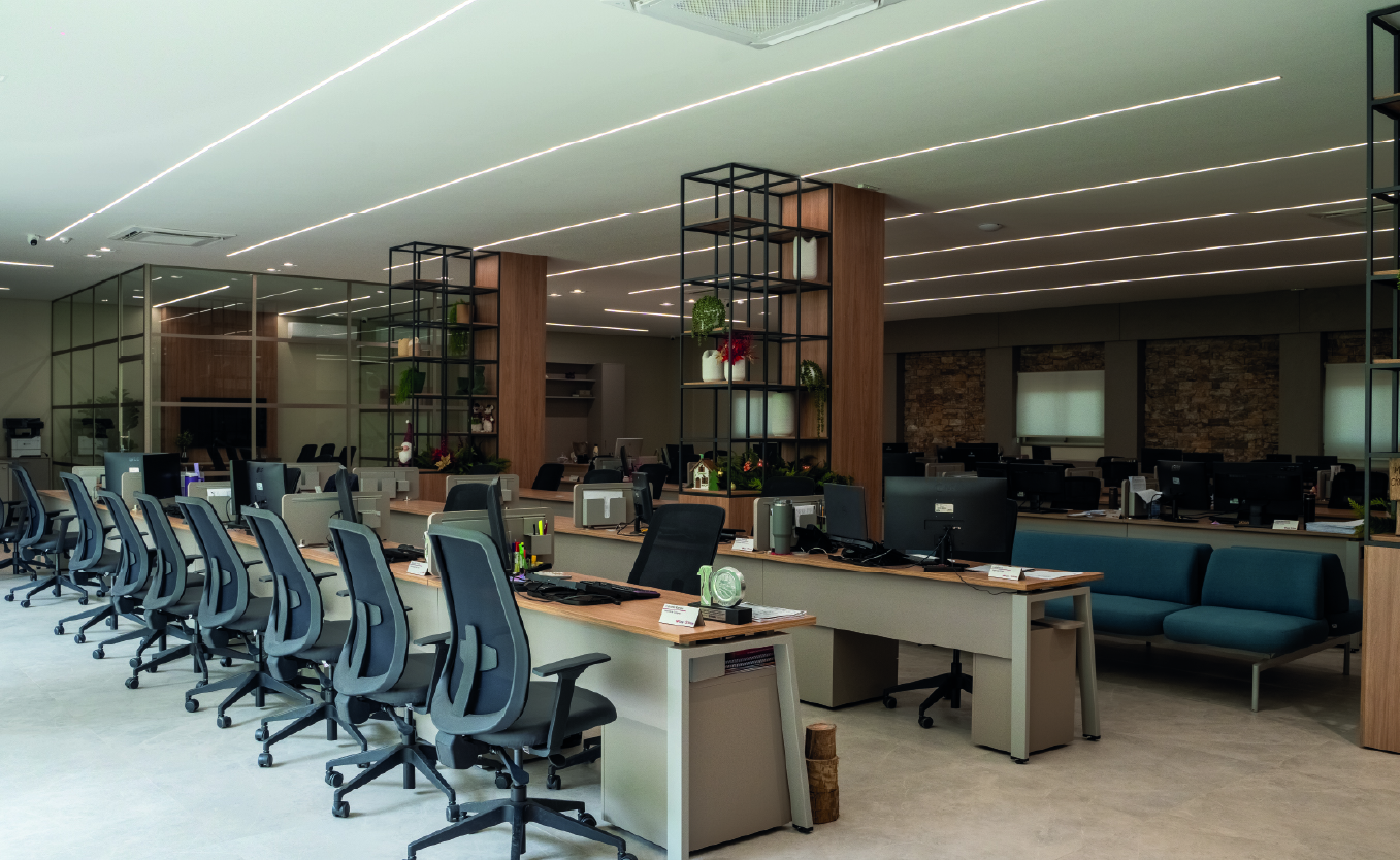 As estações de trabalho e mesas de trabalho da linha Pluri foram adotadas para compor os ambientes compartilhados com conforto e ergonomia, estimulando a produtividade e o trabalho colaborativo.