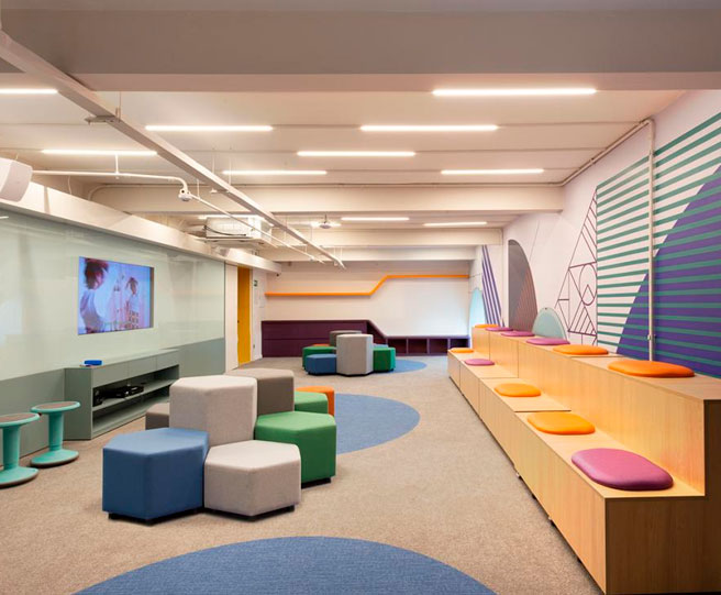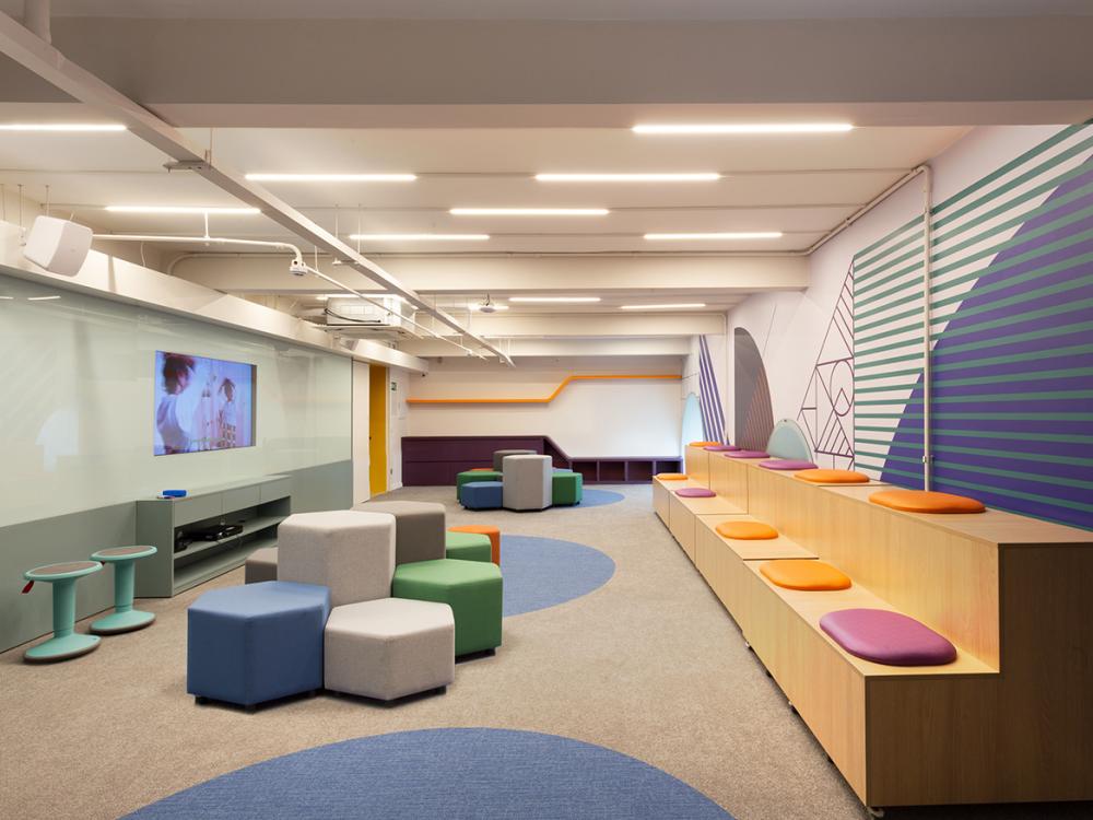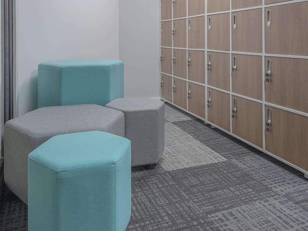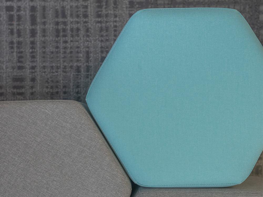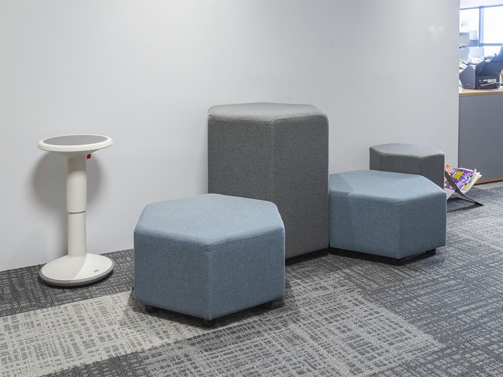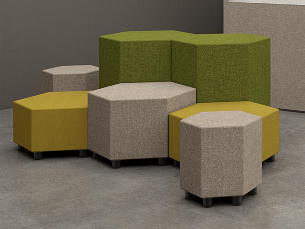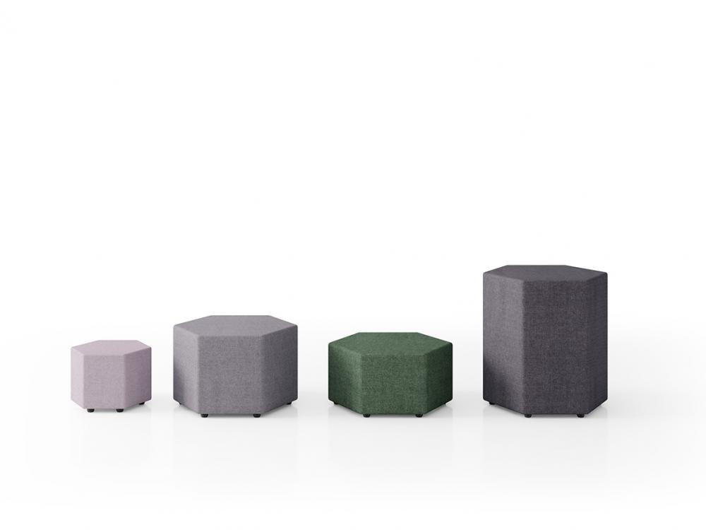 Os pufes modulados, com formato hexagonal, tem quatro opções de altura e diferentes medidas, ideais para compor ambientes colaborativos de trabalho, seja aplicando-os de maneira independente, bem como aplicando-os conjuntamente com outras linhas de produtos, como os módulos da linha Max.