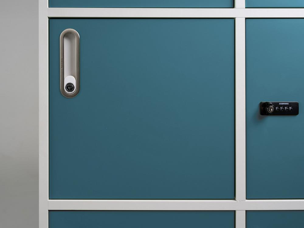 As portas dos lockers com fechadura simples ou fechadura integrada ao belo puxador embutido de aço escovado, podem ser escolhidas com laminado melaminico BP ou pintura gofrato.