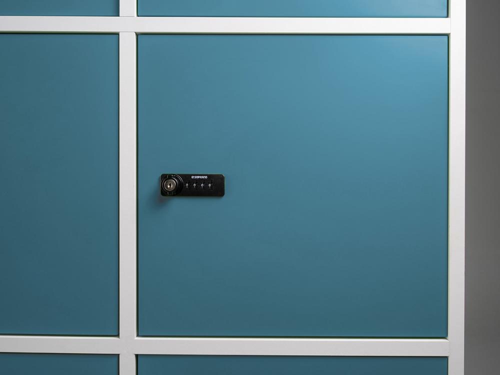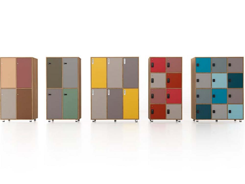 A escolha separada de cada porta permite as mais variadas combinações. Os lockers também podem ser adquiridos sem as portas, transformando-os em estantes com nichos.