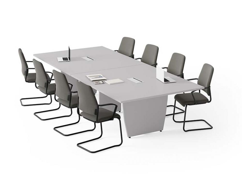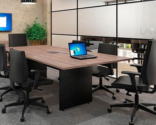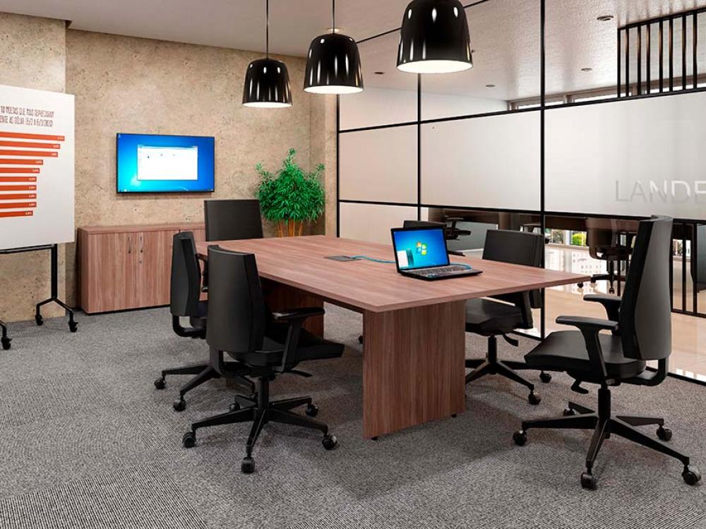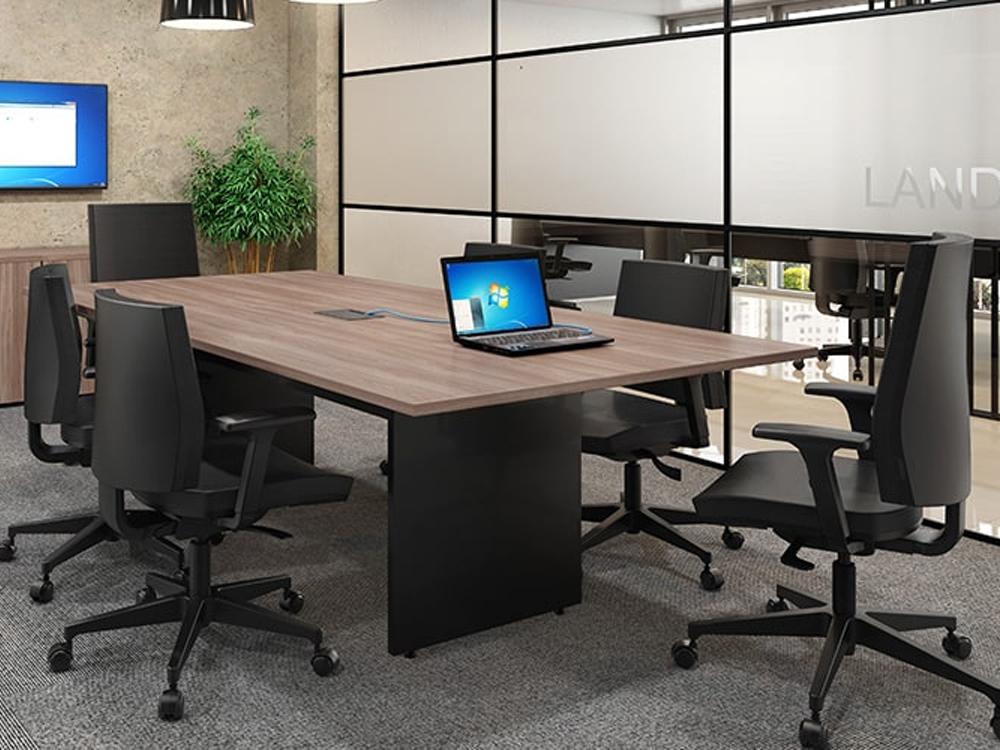 As mesas de reunião da linha Keep, totalmente produzidas em MDP, possuem formato retangular com cantos retos.