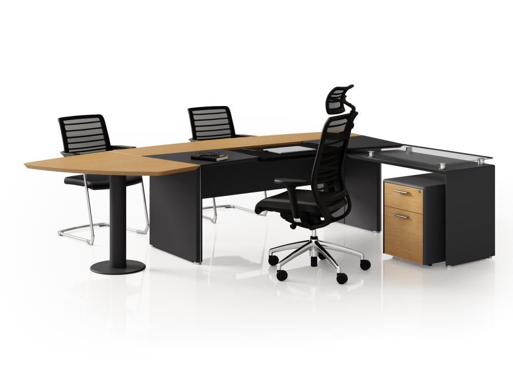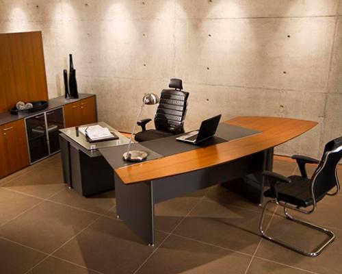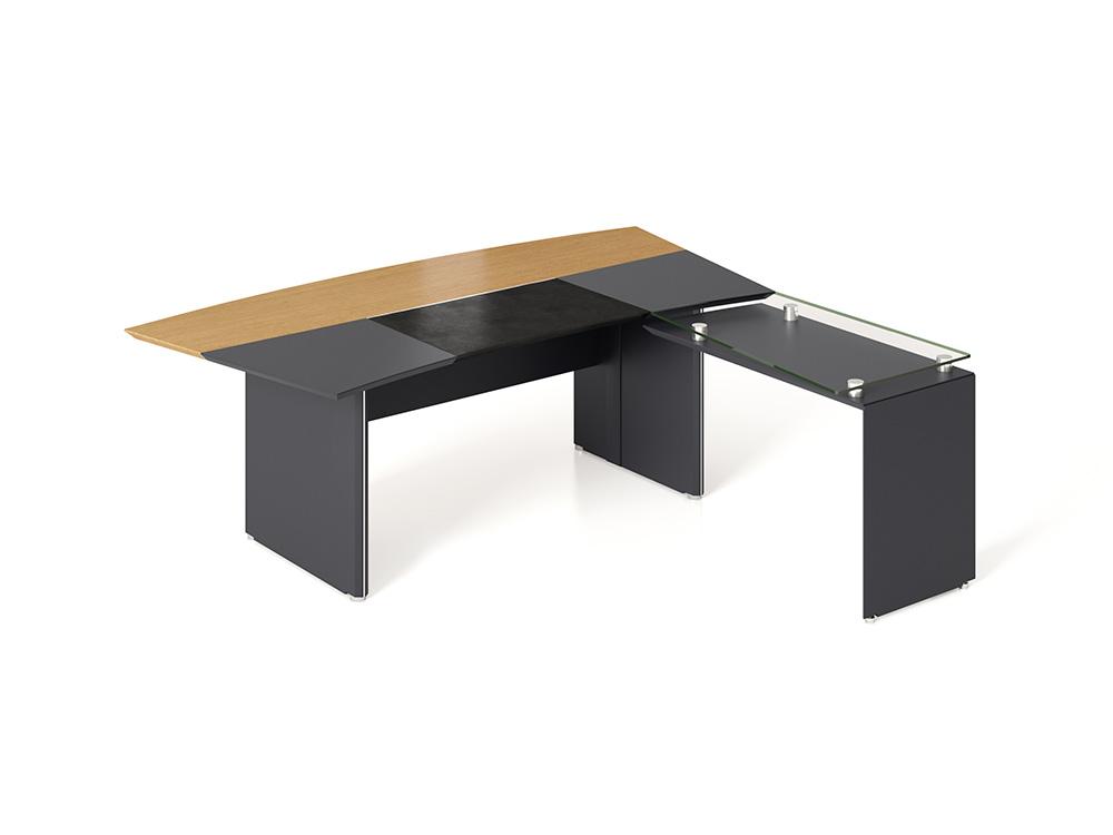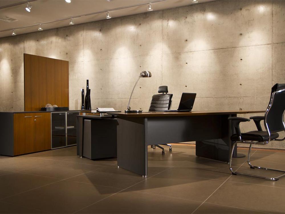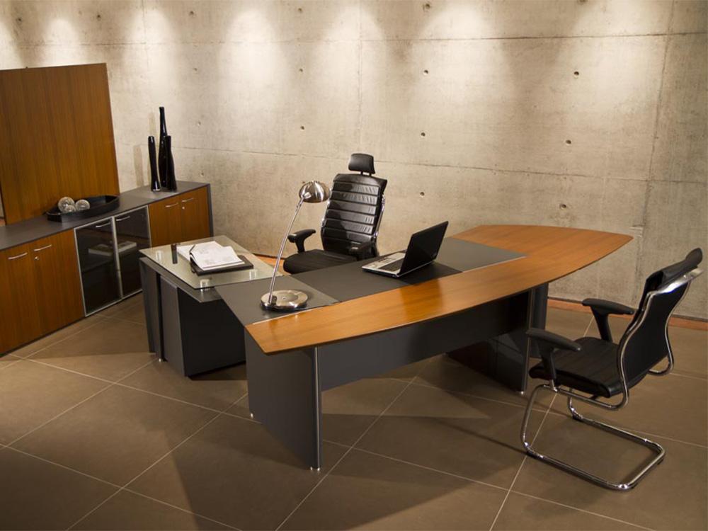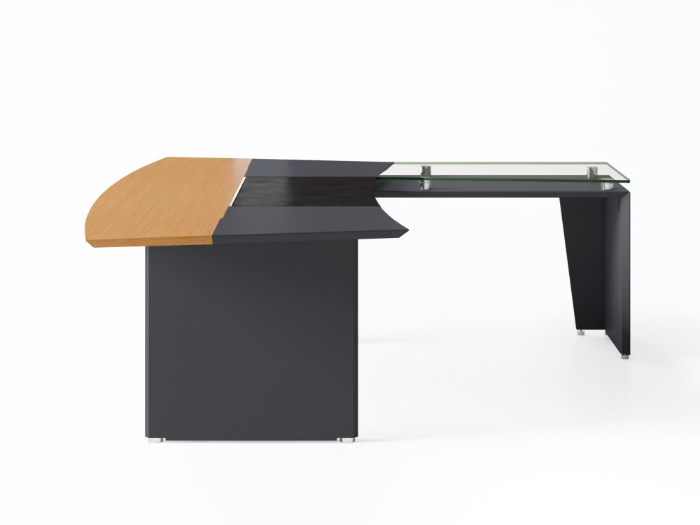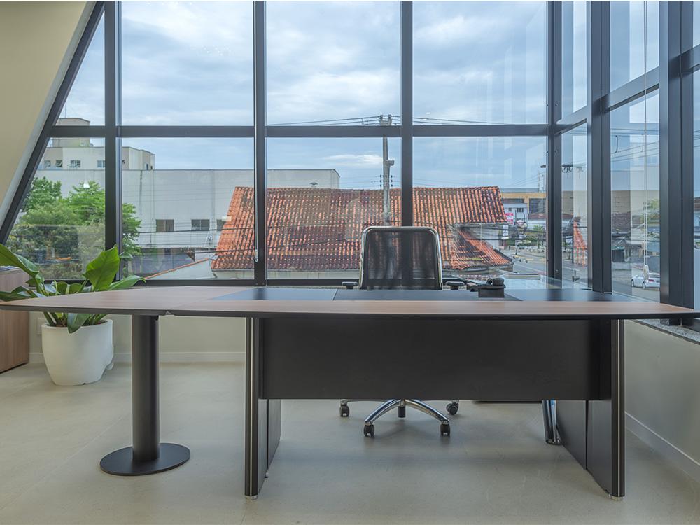 A mesa em L da linha Premium são produzidas com MDF revestido com lâmina de madeira e pintura gofrato. Possuem um bivar em couro com sistema de deslizamento para acesso às tomadas que ficam sob o tampo.