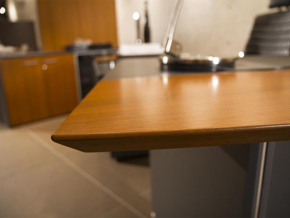 Tampos e painéis laterais produzidos em MDF 30mm com revestimento em lâmina de madeira com aplicação de pintura UV e pintura microtexturizada.