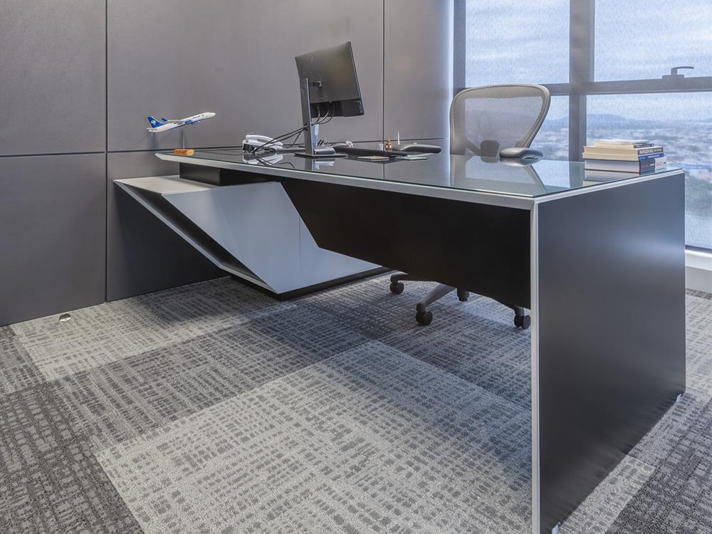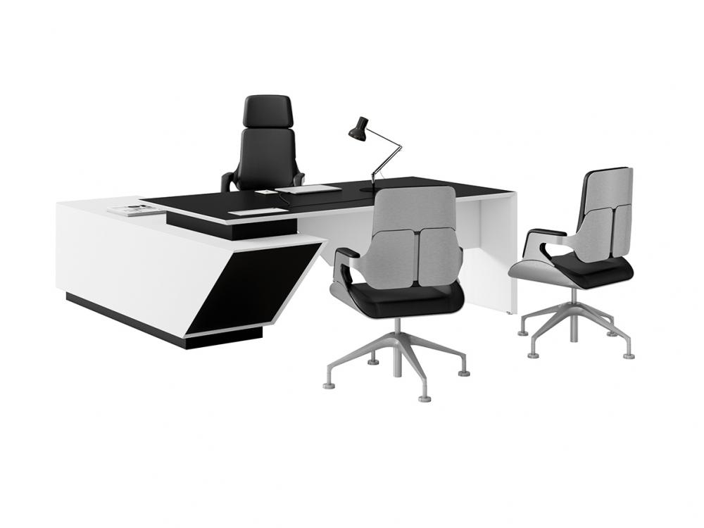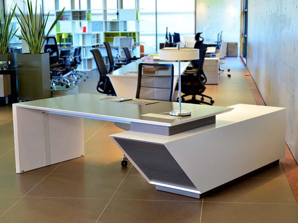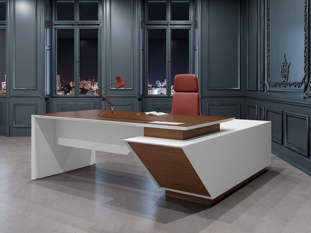 A mesa em L da linha Triarii possuí a beleza da lâmina de madeira natural aliada a pintura gofrato.