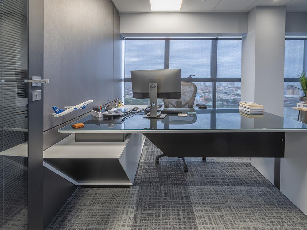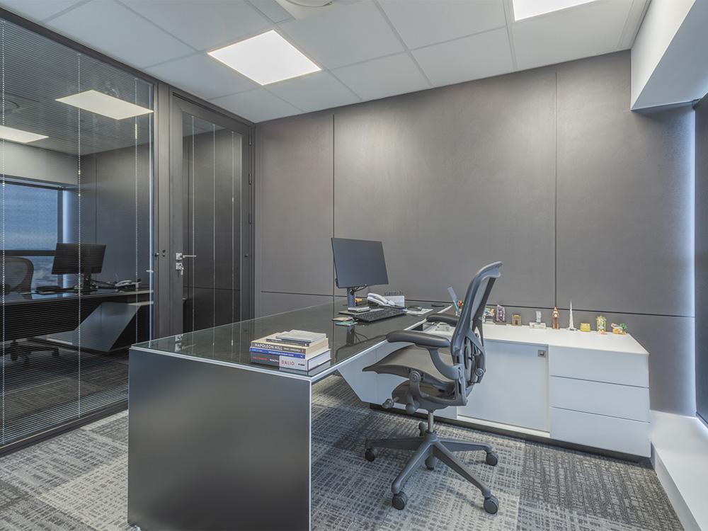 Outro detalhe elegante da mesa de trabalho é poder receber painel frontal com pintura gofrato e vidro com pintura branca ou preta.